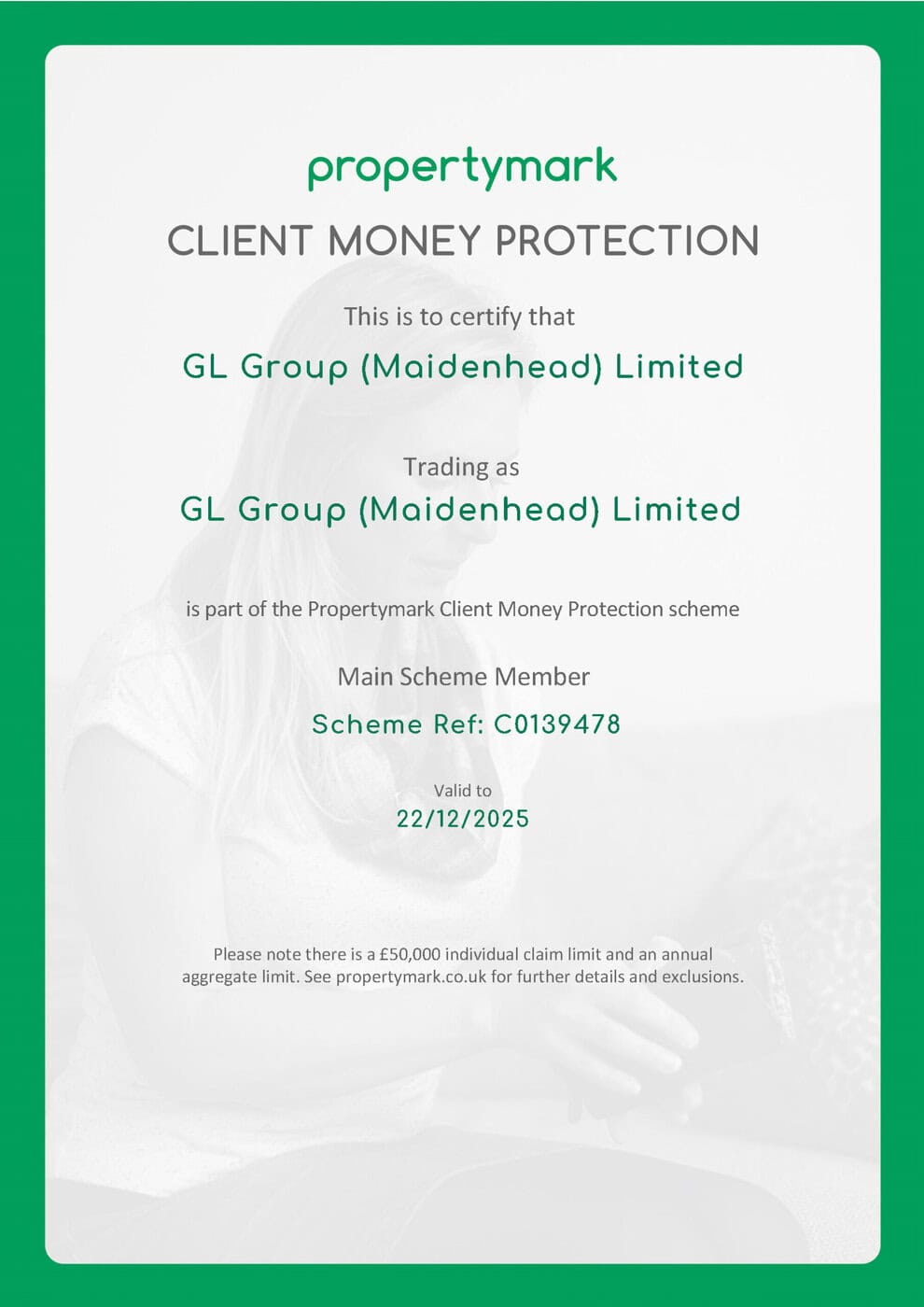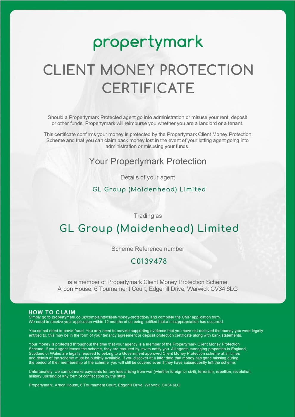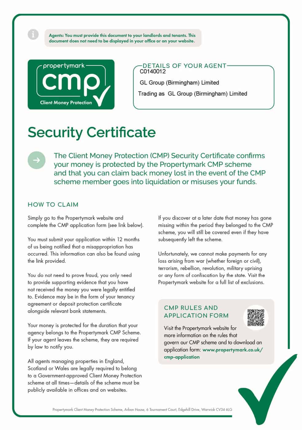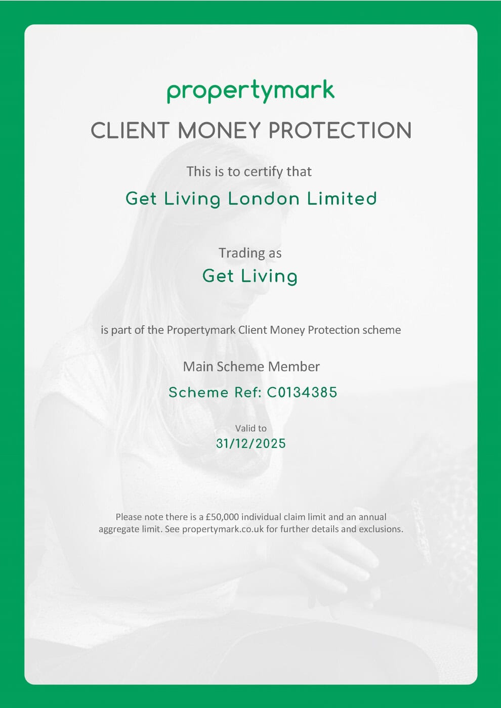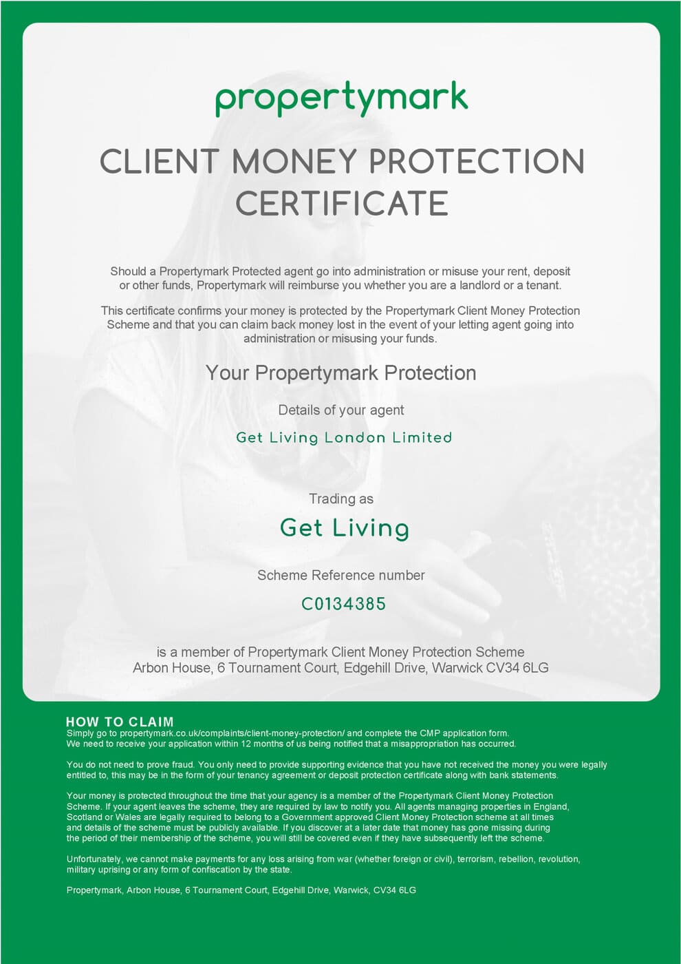 We belong to the Propertymark Client Money Protection Scheme, offering financial protection to Get Living residents that their money is secure whilst being held by us. The below certificates confirm Get Living’s membership of the scheme. Find more information on the Propertymark scheme rules on their website.